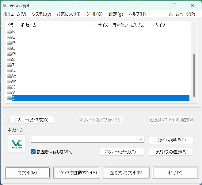 VeraCryptを起動すると、このような画面が表示されます。